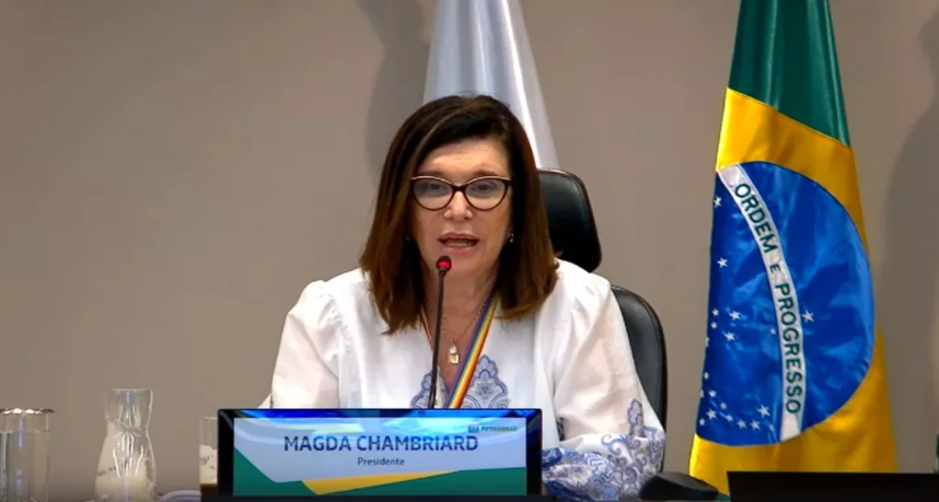 A presidente Magda Chambriard durante a coletiva de imprensa online sobre os resultados do 1º trimestre de 2025 (Foto Agência Petrobras)